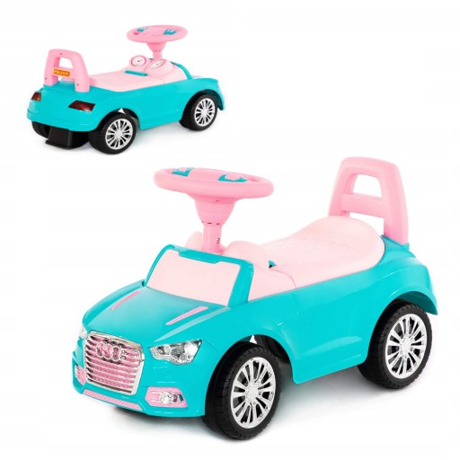 Turkusowy Samochód-jeździk Nr2 z sygnałem dźwiękowym to pojazd z serii SuperCar od firmy Polesie. Charakterystyczną cechą tej serii jest jej realistyczny design: imitacja metalizowanych powierzchni (koła, reflektory, osłona chłodnicy). Dodatkowo wszystkie samochody z tej serii posiadają wygodny układ kierowniczy z muzyczną kierownicą i przyciskami do sterowania efektami dźwiękowymi. Kierownica posiada 4 tryby: syrena (3 dźwięki) klakson dźwięk silnika zresetuj efekty dźwiękoweJeździk przeznaczony jest dla dzieci, które postawiły już swoje pierwsze kroki. Zbudowany tak, by rozwijać kolejne zdolności dziecka - wsiadanie, zsiadanie, odpychanie i kierowanie. Auto wyposażone jest w szerokie koła, które umożliwiają bezpieczne poruszanie się nim po różnego typu podłożach. Siedzenie jest wyprofilowane w taki sposób, by dolna część pleców dziecka miała stałe oparcie podczas podróży i dziecko mogło jechać odpychając się nóżkami. Auto posiada pojemny schowek do przechowywania małych przedmiotów. Zapewniony jest również element zapobiegający przewróceniu się.Samochód-jeździk na baterie. Baterii brak w zestawie. Zasilanie: 2xR6 AA (zalecane baterie alk.)Wymiary opakowania:65,5x28,5x38cmWiek: 1+