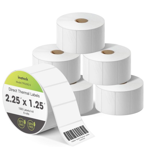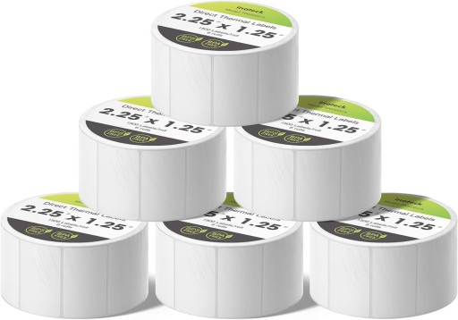 - Wymiary: 2,25 cala × 1,25 cala, 1500 etykiet na rolkę, 6 rolek w kartonie.