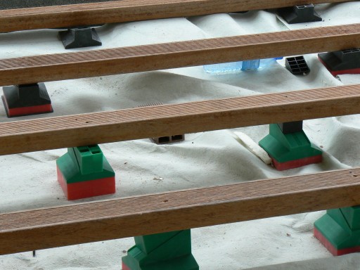 Montaż rozpoczynamy od rozstawienia wsporników i ułożenia na nich legarów. Następnie przez odpowiednie przesuwanie klinów na stopkach poziomujemy legary.