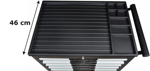 Wyposażona jest 4 kółka jezdne, w tym 2 z hamulcem, szuflady wyłożone pianką, oraz centralny zamek. Dodatkowym udogodnieniem jest blat z przegródkami.