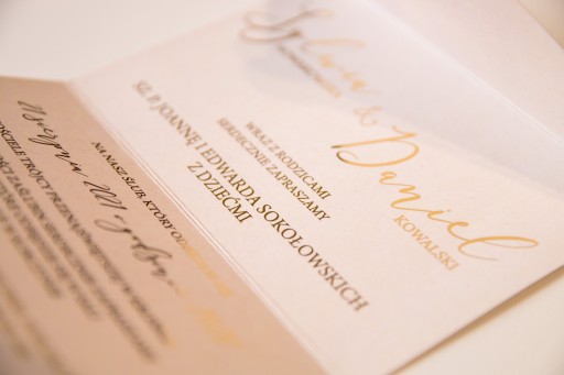Neutralna, jasna kolorystyka zaproszeń podkreślona jest eleganckim, złotym lakiem oraz efektownym złotym tekstem.
