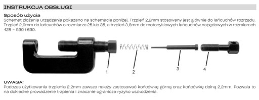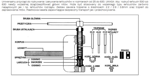 Uwaga: W łańcuchach 530 i 630 należy wcześniej zeszlifować główkę nita.