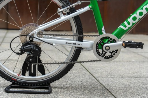 Układ napędowy to klasyczna korba z kutego aluminium o długości 110 mm. Przednia zębatka posiada 28 zębów, a tylna kaseta składa się z 7 zębatek posiadających od 11 do 28 zębów. Za zmianę biegów w tym modelu odpowiada przerzutka SRAM X4 wraz z manetką obrotową Sram Grip Shift pozwalającą na płynny wybór jednego z ośmiu biegów. Korby zakończone są plastikowymi pedałami, a obie zębatki połączone są ze sobą łańcuchem. Stabilne pedały Woom płaskie, wąskie pedały platformowe z tworzywa sztucznego z zamkniętym wkładem suportu.