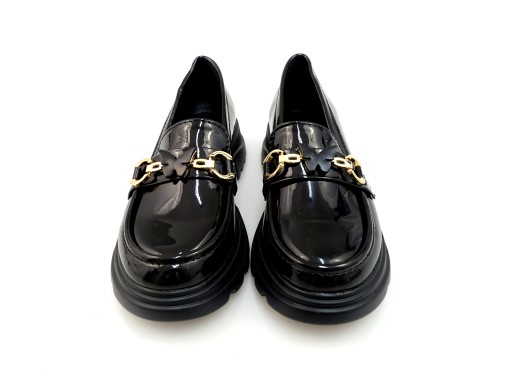 DWSUWANE DZIEWCZĘCE LOAFERSY LAKIEROWANE MOKASYNY PÓŁBUTY CZARNE Z KLAMRĄ