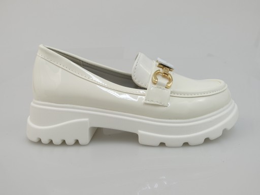 DWSUWANE DZIEWCZĘCE LOAFERSY LAKIEROWANE MOKASYNY PÓŁBUTY BIAŁE Z KLAMRĄ