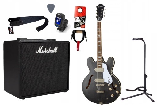 Zestaw gitarowy, elementy zestawu: 1x Gitara elektryczna (opis poniżej), 1x Combo gitarowe 15W (Marshall MG15 GFX Gold), 1x Kabel gitarowy 3m (Red's Music GC1130BX), 1x Statyw do Gitary (Hamilton Stands KB-303), 1x Tuner gitarowy (Nexon UTV-200), 1x Pasek do gitary (Rali Nylon70), 1x Kostka gitarowa (Janicek).