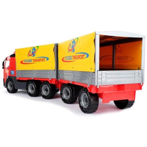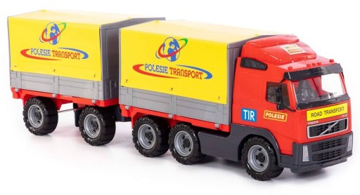 Samochód z plandeką i przyczepą VOLVO to duża ciężarówka wyposażona w szerokie koła połączone metalowymi osiami. Ich struktura nie jest gładka, co ułatwia jazdę po nierównych powierzchniach. Posiada naczepę oraz dołączoną do niej przyczepę. Na jednej i drugiej umieszczono stelaż z plandeką. Burty naczepy oraz przyczepy można otworzyć, a plandekę unieść do góry. Kabina kierowcy jest oszklona. Użyto w tym celu grubego, przezroczystego plastiku. Wymiary: 76x24x17cm. Wiek: 3+