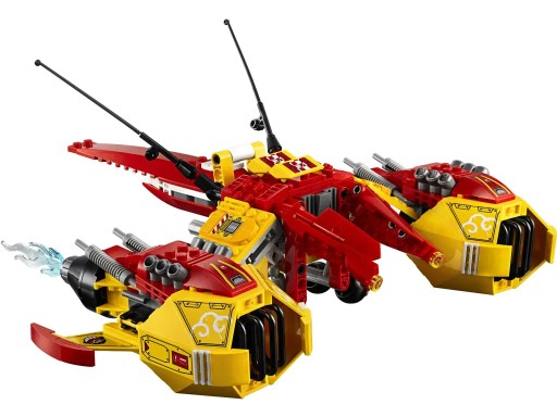 - Odrzutowiec ma ruchome skrzydła z dwoma miotaczami dysków, wielki podwójny silnik odrzutowy oraz kokpit dla minifigurki Monkie Kida, który po odłączeniu zmienia się w motocykl LEGO® i pozwala przenieść walkę na ziemię.