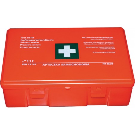 Wysokiej jakości plastikowa apteczka samochodowa DIN-13164 spełniająca wymagania Unii Europejskiej. To niezbędny zestaw, gdy zachodzi potrzeba udzielenia pierwszej pomocy.