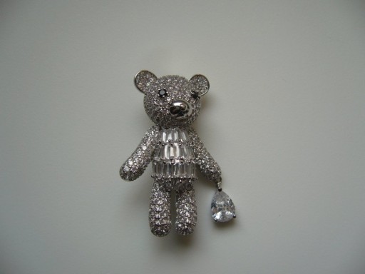 UROCZA POSREBRZANA BROSZKA MIŚ , ZDOBIONA SZKLANYMI CYRKONIAMI
