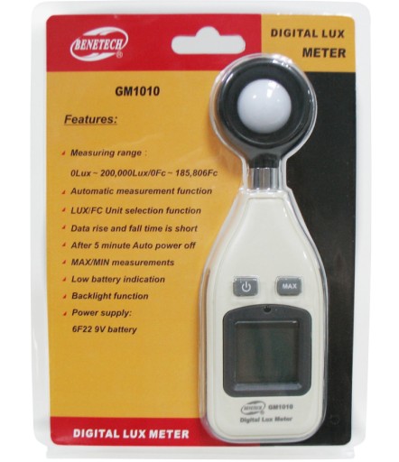 Luksomierz GM 1010 marki Benetech to narzędzie do pomiaru natężenia światła o zakresie 1-200 000 Lux . Urządzenie znajduje zastosowanie w wielu dziedzinach. Miernik może być użytkowany w przemyśle elektryczno-optycznym. Jest stosowany również do celów inspekcyjnych pomieszczeń w których pracują lub przebywają ludzie, a także przy hodowli roślin i zwierząt.