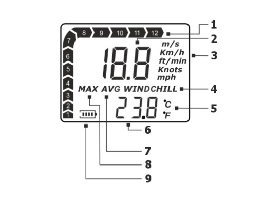 - Zakres: 0~30 m/s / 0~5860 Ft/min / 0~55 Węzły / 0~90 Km/h / 0~65 Mph