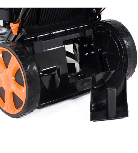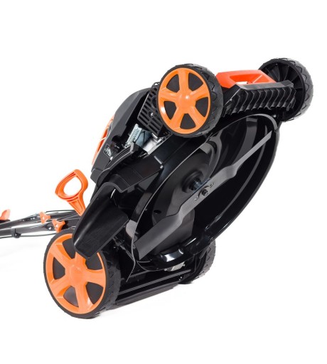 Duże łożyskowane tylne koła zmniejszają opory toczenia i ułatwiają prowadzenie kosiarki. Na przodzie obudowy znajduje się rączka, dzięki której można łatwo unieść kosiarkę.