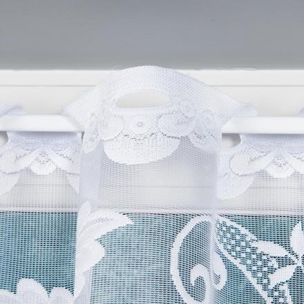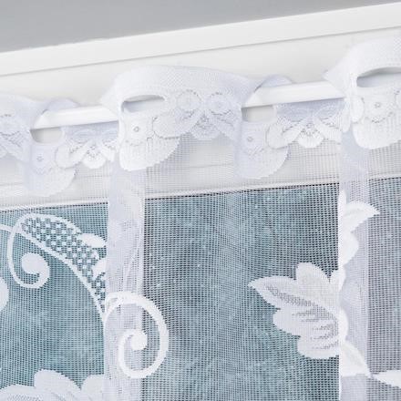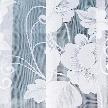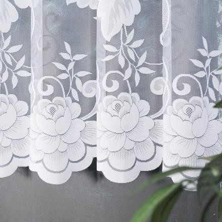 Piękna firana żakardowa na metry o wysokości 70cm w kolorze białym. U góry posiada otwory do wsunięcia na drążek lub patyczek. Piękny wzór w duże stylowe kwiaty idealnie sprawdzi się w każdej kuchni, łazience bądź na klatce schodowej.