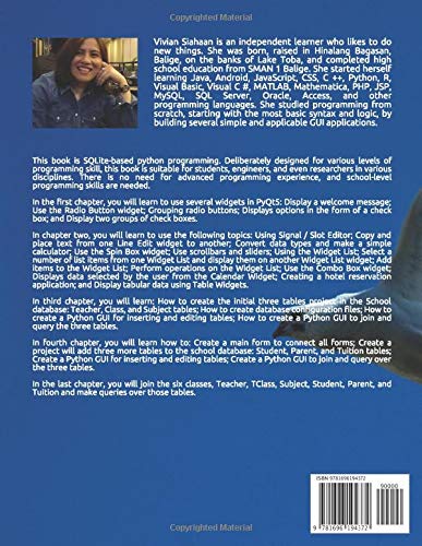This book is SQLite-based python programming. Deliberately designed for various levels of programming skill, this book is suitable for students, engineers, and even researchers in various disciplines. There is no need for advanced programming experience, and school-level programming skills are needed.In the first chapter, you will learn to use several widgets in PyQt5: Display a welcome message; Use the Radio Button widget; Grouping radio buttons; Displays options in the form of a check box; and Display two groups of check boxes.In chapter two, you will learn to use the following topics: Using Signal / Slot Editor; Copy and place text from one Line Edit widget to another; Convert data types and make a simple calculator; Use the Spin Box widget; Use scrollbars and sliders; Using the Widget List; Select a number of list items from one Widget List and display them on another Widget List widget; Add items to the Widget List; Perform operations on the Widget List; Use the Combo Box widget; Displays data selected by the user from the Calendar Widget; Creating a hotel reservation application; and Display tabular data using Table Widgets.In third chapter, you will learn: How to create the initial three tables project in the School database: Teacher, Class, and Subject tables; How to create database configuration files; How to create a Python GUI for inserting and editing tables; How to create a Python GUI to join and query the three tables. In fourth chapter, you will learn how to: Create a main form to connect all forms; Create a project will add three more tables to the school database: Student, Parent, and Tuition tables; Create a Python GUI for inserting and editing tables; Create a Python GUI to join and query over the three tables.In the last chapter, you will join the six classes, Teacher, TClass, Subject, Student, Parent, and Tuition and make queries over those tables.