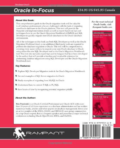 One of the biggest challenges that IT departments currently face is how to migrate their non-Oracle databases to Oracle platform with limited budget, staff, and time constraints. In order to meet these needs, Oracle originally developed an excellent tool called the Oracle Migration Workbench (OMWB). As the latest and greatest enhancement to migration software, Oracle has provided the new version of migration tools along with a full development environment with the SQL Developer software with Oracle 10g and 11g database releases as the method of choice to accomplish these daunting tasks. This comprehensive guide to these new Oracle migration tools will be valuable to all database professionals who are challenged with the task of migrating their non-Oracle databases to the Oracle 10g and 11g platforms. This text will provide the blueprint and implementation details as well as expert hands-on tips and techniques on how to use this new migration tool to quickly migrate non-Oracle databases to the Oracle 10g database environment. Topics will include a detailed discussion of these tools including coverage of both SQL Developer and the Oracle Migration Workbench installation and configuration process, techniques on how to best use the editors for parsing non-Oracle SQL and stored procedures to map to the Oracle SQL and PL/SQL code, problem resolution and troubleshooting during the migration process, and testing procedures after the initial migration has been completed. This book distills the very complex and technical challenges of how to best migrate your non-Oracle database into an easily digested format with clear step by step techniques that all database professionals can implement right away.