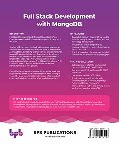 Starting with the basics, the book will assist any programmer and developer and those who deal with NodeJS, PHP, Python and React Native in setting up their working environment with MongoDB. Various full-stack configurations of libraries and frameworks for mobile and web applications are covered in length in this book. REST API, CRUD operations are also explained in a detailed manner. The skills you learn to use PHP, ExpressJS, NodeJS, Python and React Native become increasingly solid as time goes on.