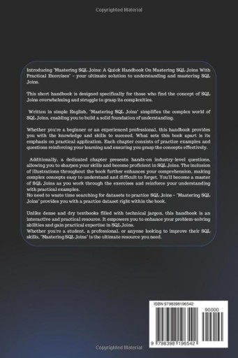 In this short handbook, you'll discover: Simplified SQL joins concept in clear and concise language that helps you in creating a solid foundation for understanding SQL joins. Practice questions after every chapter so that you reinforce your learning Dedicated chapter for hands-on industry-level questions that will polish your skills Illustrations to make things easy to understand and hard to forget so that you become a master in SQL Joins Practice Dataset included in the book so that you don't have to waste time in finding the right dataset for practice SQL Joins.