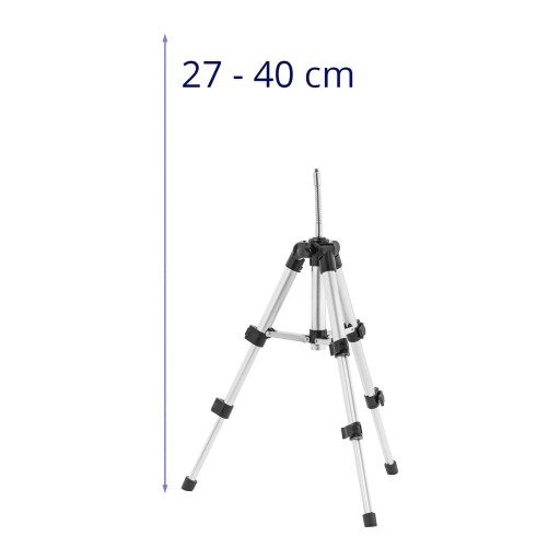 Statyw marki Steinberg Systems sprawdzi się do ustawienia zarówno lasera krzyżowego jak i aparatu. Wysokość statywu jest płynnie regulowana w zakresie 270-402 mm za pomocą trzech nóg. Gwint 1/4" pozwala zamocować sprzęt, zarówno laser krzyżowy jak i lustrzankę cyfrową. Zrównoważona konstrukcja zapewnia stabilność sprzętu. Wykonana została ze stopu aluminium, jest wytrzymała i idealna do transportu.