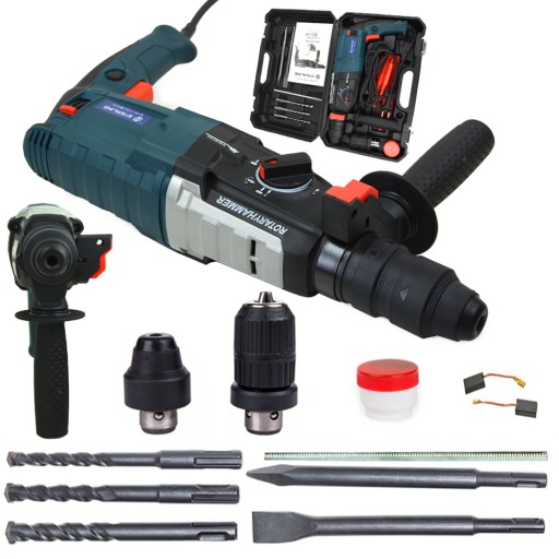 Wyposażona w wydajny silnik elektryczny o mocy 2950W. Idealnie sprawdzi się podczas wszelkiego rodzaju prac budowlanych, remontowych takich jak np. kucie, skuwanie tynków, kafelek, wiercenie, wkręcanie/wykręcanie itp. Urządzenie wyposażone w dwie głowice wiertarskie (SDS+ oraz głowica szybko-zaciskowa).