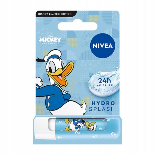 NIVEA Hydro Splash – Donald Duck Disney Limited Edition ze skutecznymi składnikami pochodzenia naturalnego wtapia się w usta i zapewnia nawilżenie przez ponad 24 godziny. Dzięki lekkiej formule Twoje usta będą chronione przed zimnem, wiatrem i suchym powietrzem. Ponadto dzięki SPF15 pomadka chroni przed promieniowaniem UVA / UVB.