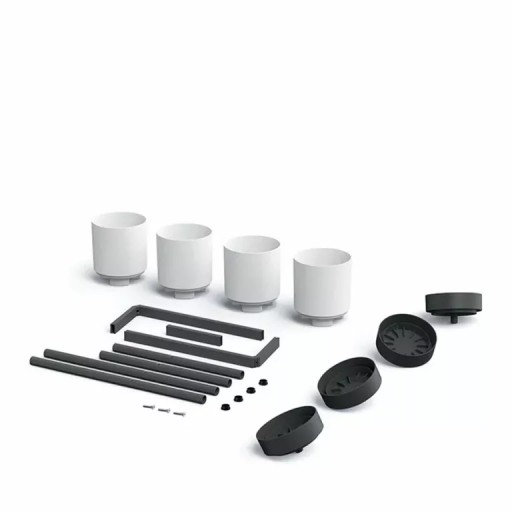 Są to cztery proste, doniczki uzupełnione wysoką industrialną metalową ramą.Dzięki zróżnicowanej wysokości doniczek, kwietnik wygląda na przestronny i jest idealny do podkreślenia piękna każdej rośliny w ciasnych przestrzeniach.