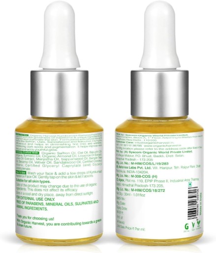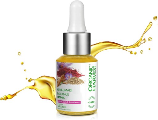 Zwiększa blask: Pełen dobroci szafranu, mleka owsianego i drzewa sandałowego, Organic Harvest Kumkumadi Radiance Face Oil doskonale redukuje ciemne plamy i matowość, odsłaniając promienną skórę.