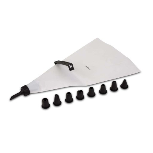 W zestawie: 1x worek o pojemności 500 ml, 1x adapter, 1x końcówka do nadziewania, 8x końcówka do dekorowania, 1x klips do zamykania.