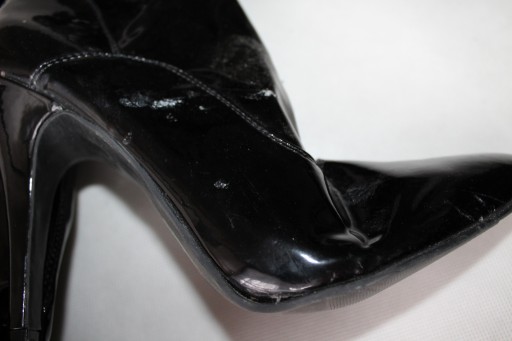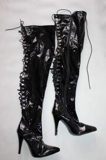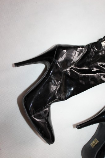 Lakierowane, długie, regulowane kozaczki, zapinane z boku na zamek- używane stan dobry- widoczne ślady użytkowania- rysy, otarcia, podeszwa do podklejenia- zdjęcia. WYMIARY dł wkładki około- 27,5 cm, wysokość- 68, 80 cm, obcas- 12 cm.