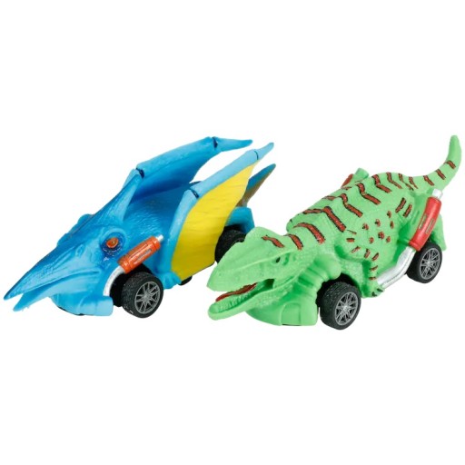 Pociągnij pojazdy do tyłu i puść je, a popędzą do przodu. Dinozaury walczą ze sobą!