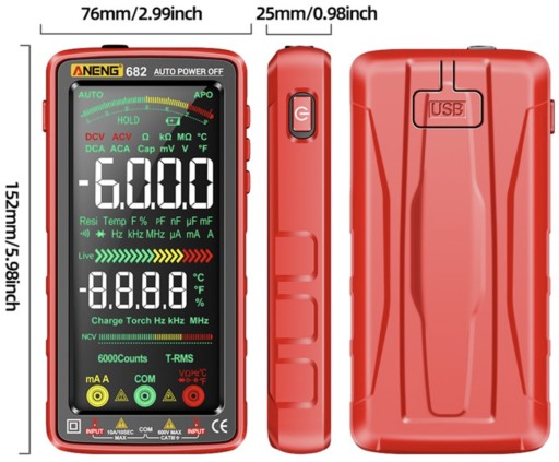 Multimetr ANENG 682 jest wyposażony w kolorowy dotykowy duży wyświetlacz LCD 5 cali.