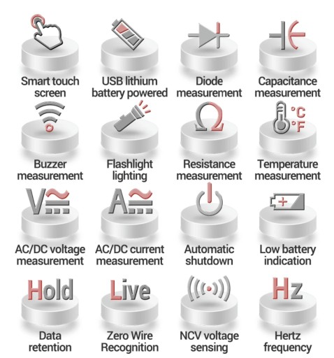 - Wielofunkcyjny tester: w tym funkcje pomiarowe napięcia AC/DC, prądu AC/DC, rezystancji, pojemności, temperatury, częstotliwości, diody, włączania/wyłączania, drutu o zerowym ogniu itp.