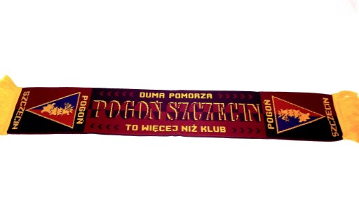 POGOŃ SZCZECIN -szal dziany,dwustronny, na końcach żółte frędzle.Napis na szaliku DUMA POMORZA--POGOŃ SZCZECIN--TO WIĘCEJ NIŻ KLUB.