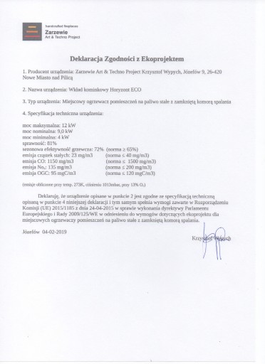 - produkt spełnia wymagania: ROZPORZĄDZENIA KOMISJI (UE) 2015/1185 z dnia 24 kwietnia 2015 r. w sprawie wykonania dyrektywy Parlamentu Europejskiego i Rady 2009/125/WE w odniesieniu do wymogów dotyczących ekoprojektu dla miejscowych ogrzewaczy pomieszczeń na paliwo stałe