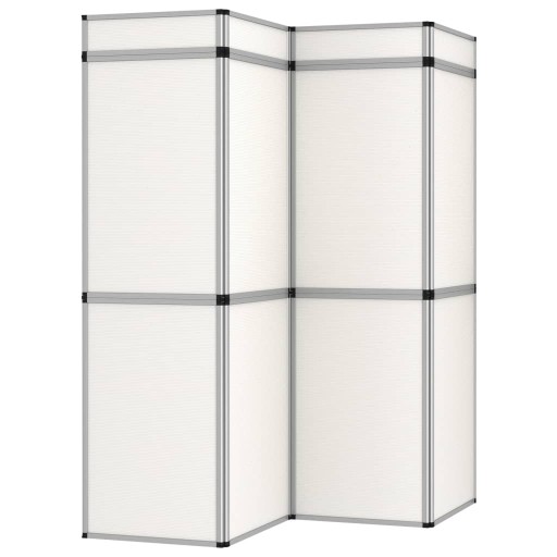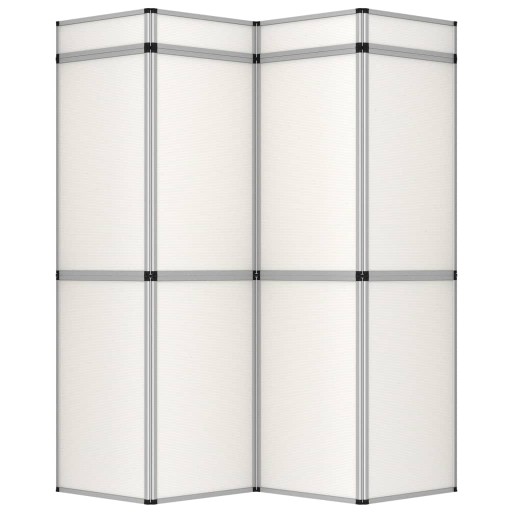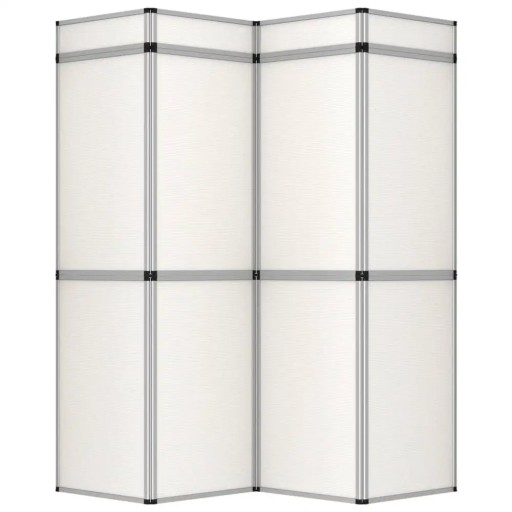 Ścianka ta może posłużyć jako parawan lub ściana prezentacyjna na targach. Plakaty reklamowe i promocyjne można z łatwością przymocować do ścianki wystawienniczej, która w ten sposób służy jako gigantyczny system ekspozycji materiałów. Cztery dodatkowe pola w górnej części pozwalają podkreślić nazwę firmy lub inne ważne informacje. Wykonana z wysokiej jakości stopu aluminium i płyty PP, ścianka wystawiennicza jest trwała i stabilna. Tablicę ekspozycyjną można złożyć i ustawić w różnych kształtach, aby spełniała wszelkie potrzeby. Gdy nie jest używana, można ją łatwo zdemontować i złożyć, aby ułatwić przechowywanie.