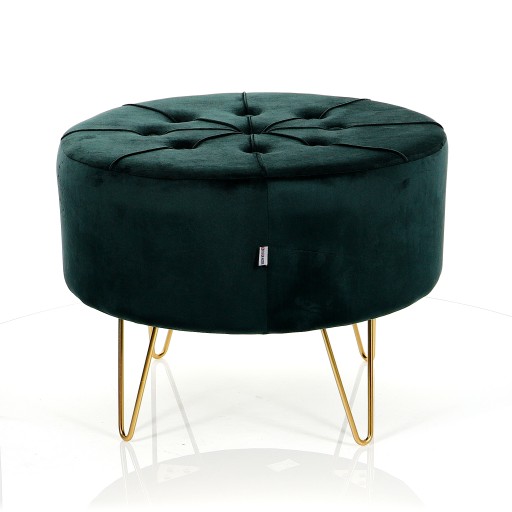 Pufa Alia pikowany welur w kolorze zieleni butelkowej nogi metalowe z stali malowanej proszkowo na kolor złoty Wymiary po złożeniu: Ø56cm, wysokość 43cm