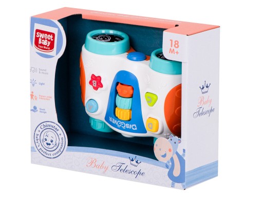 Kolorowy teleskop interaktywny dla dzieci. Z zabawki wydobywają się światła i dźwięki po naciśnięciu przycisków. Rozwija koordynacje wzrokowo-ruchową. Zasilanie na baterie 2x AA (brak w zestawie). Tworzywo: plastik. Wymiary: 13.5x10.5x5.5cm.