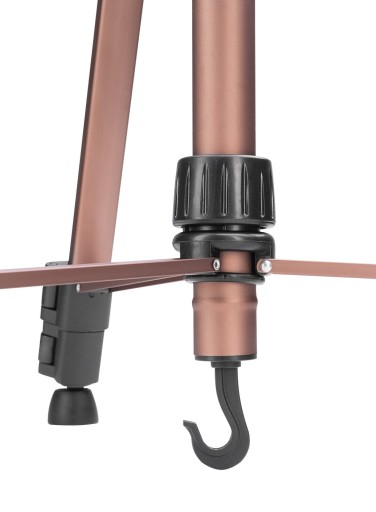 Statyw posiada też hak do przywieszenia obciążenia oraz stopki z przegubami znacznie poprawiające stabilność.