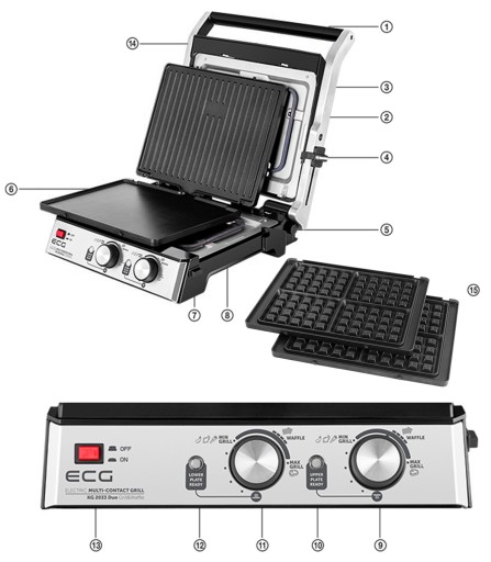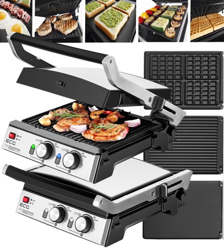 - ECG KG 2033 Duo Grill & Waffle jest naprawdę wszechstronnym pomocnikiem w kuchni. Istnieje wiele różnych sposobów wykorzystania płytek grilla, które pokryte są wysokiej jakości powłokami TEFLON NON-STICK. Urządzenie posiada regulowaną wysokość górnej płyty.