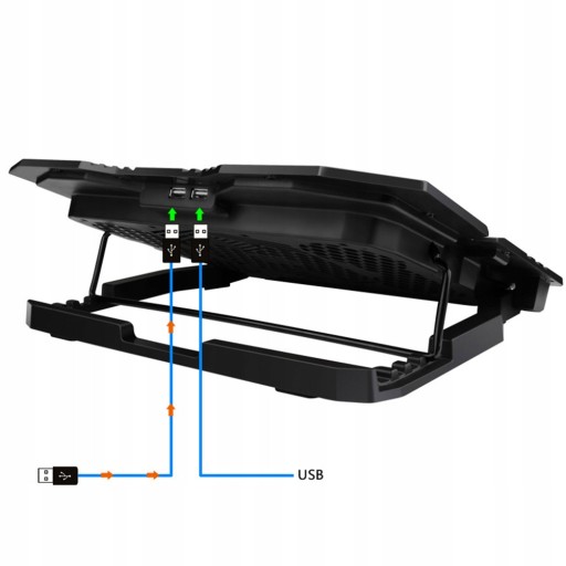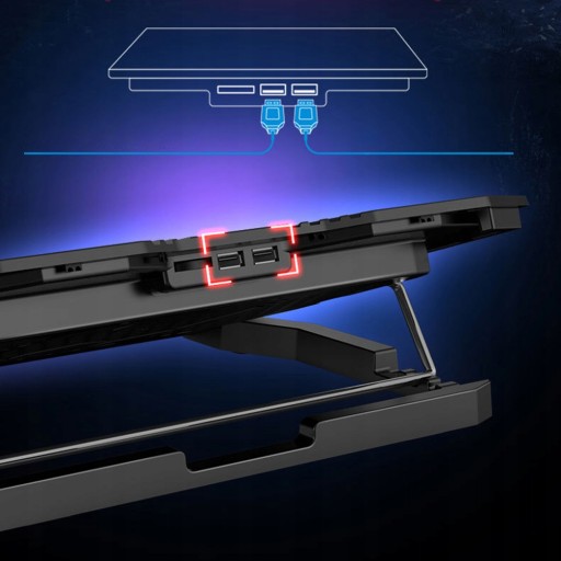 - Ten stojak ma powierzchnię metalową siatką, która łączy z 5 fanami chłodzącymi, aby pomóc rozpraszać uszkodzone ciepło z dala od laptopa lub komputera notebooka.