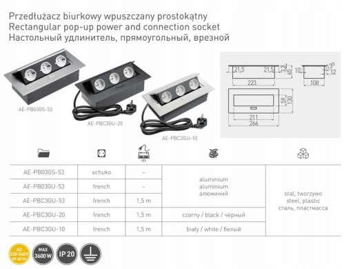 Przedłużacz biurkowy SOFT wpuszczany prostokątny 3 gniazda z bolcem