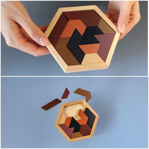 Tangram Puzzle - to wyjątkowe wyzwanie polegające na ułożeniu 11 różnokolorowych dwustronnych elementów w obrębie heksagonu. Łamigłówka została wykonana z drewna, zapewniając atrakcyjny wygląd oraz trwałość.