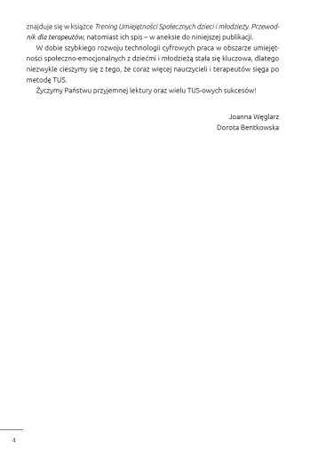Druga część książki Trening Umiejętności Społecznych dzieci i młodzieży jest uzupełnieniem podręcznika dla terapeutów i wyposaża czytelnika w dodatkowe 100 ćwiczeń, które można wykorzystać podczas zajęć prowadzonych metodą Treningu Umiejętności Społecznych (TUS) lub innego rodzaju interwencji terapeutycznych skupionych na rozwijaniu umiejętności społeczno-emocjonalnych.