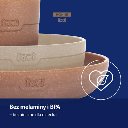 Produkty LOVI są lekkie, poręczne, łatwe do trzymania oraz posiadają bezpieczne, obłe kształty dzięki czemu mogą być używane zarówno przez rodziców, jak i dzieci. Do produkcji naczyń zastosowaliśmy 20% mączki drzewnej pochodzącej z recyklingu, dzięki czemu w ich składzie znajduje się mniej plastiku, a co najważniejsze naczynia te są wolne od melaminy oraz BPA.