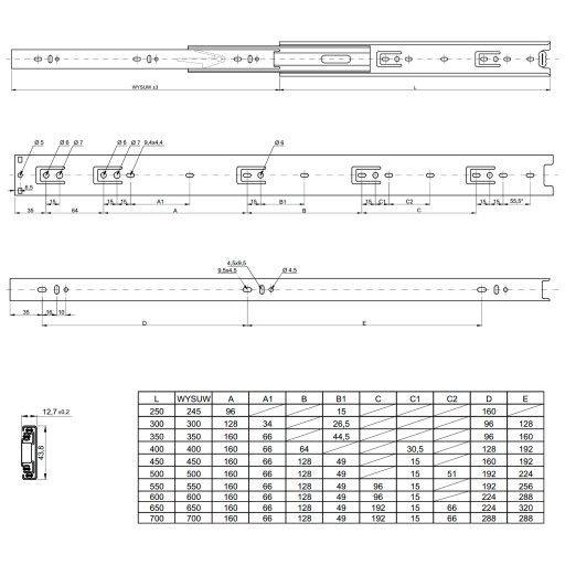 Prowadnica meblowa kulkowa 43,8 x 450 x 12,7 mm