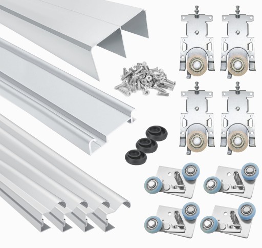 W skład zestawu wchodzą wszystkie profile i okucia które potrzebujesz do skręcenia drzwi przesuwnych.