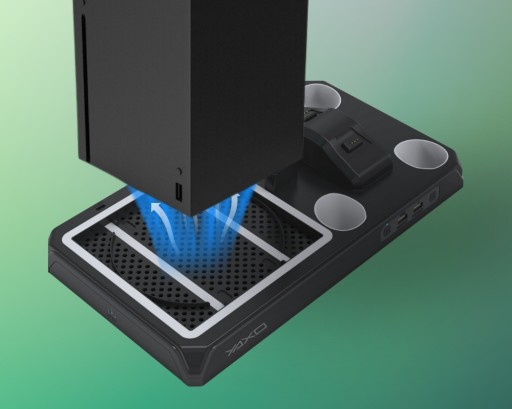 - To połączenie aż 4 funkcji: chłodzenia konsoli, ładowania padów, półki na gry i wieszaka na słuchawki.