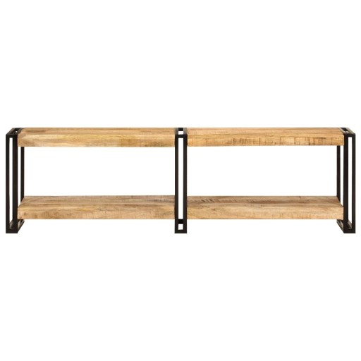 Ta wpisująca się w najnowsze trendy, drewniana szafka pod telewizor wygląda stylowo i elegancko, dzięki czemu będzie dekoracyjnym i praktycznym dodatkiem do Twojego wystroju wnętrza. Lite drewno mango: drewno mango jest mocnym drewnem tropikalnym, z którego powstają solidne meble. Jego piękne usłojenie sprawia, że każdy egzemplarz jest unikatowy i nieco odmienny od pozostałych.Spora przestrzeń do przechowywania: szafka pod TV z półkami zapewni Ci wystarczająco dużo miejsca do przechowywania niezbędnych rzeczy w sposób uporządkowany i w zasięgu ręki.Metalowa rama: rama z metalu zapewnia trwałość i stabilność konstrukcji.Funkcja ekspozycyjna: solidny blat tej szafki pod TV idealnie nadaje się do wyeksponowania roślin doniczkowych, ramek ze zdjęciami i przedmiotów dekoracyjnych. Warto wiedzieć:Kolory i usłojenie poszczególnych egzemplarzy mogą się różnić, dzięki czemu każdy z nich jest unikatowy. Wysyłka przebiega losowo, dzięki czemu otrzymasz zupełnie wyjątkowy i niepowtarzalny produkt.
