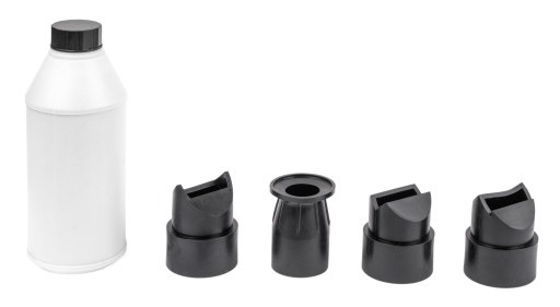 Do kompletu dołączono 4 wymienne dysze kształtujące strumień ścierniwa oraz profesjonalne ścierniwo w butelce 1L.