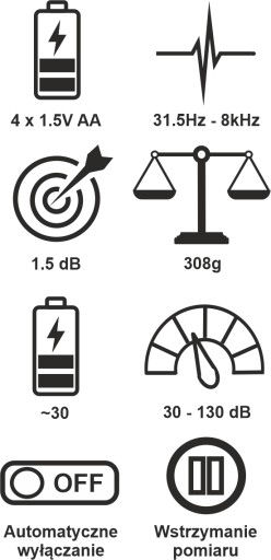 - Przełącznik zakresu poziomów: 30dB~80dB;50dB~100dB;60dB~110dB; 80dB~130dB; 30~130dB.